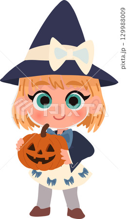 cute girl in witch outfit carrying jack o lantern pumpkin illustration showing halloween culture autumn festival fun and childhood celebration