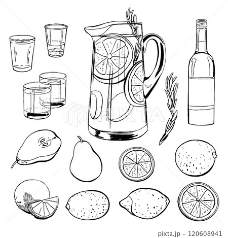 Sangria Refreshments with Fruits Set. Black Vector Outline Drink Illustration Collection Isolated on White