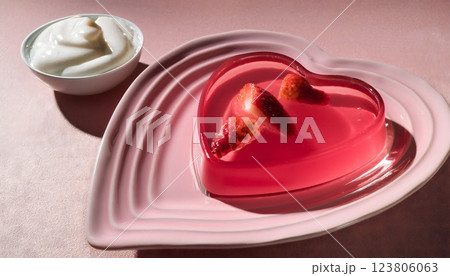 A heart shaped plate with a strawberry dessert on it