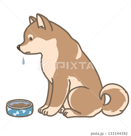 一隻柴犬坐在食物碗前,流著口水,一隻手張開。