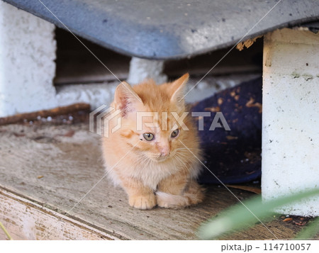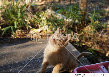 一隻可愛的小貓在它出生的灌木叢裡活潑地玩耍