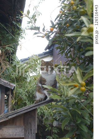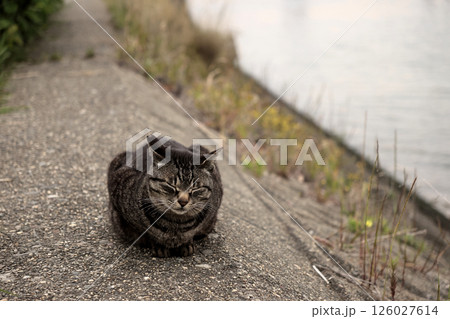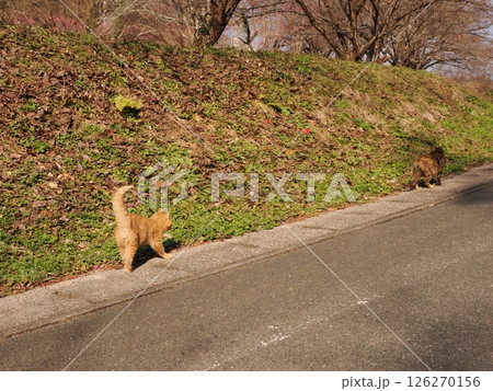 【日本】千葉縣市川市法華寺,一隻貓在灑滿櫻花花瓣的地面上行走