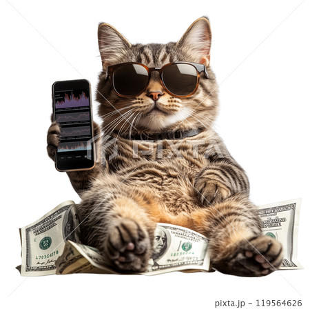 A stylish cat, sporting sunglasses and holding a smartphone displaying real-time stock market data, sits atop a pile of dollar bills.