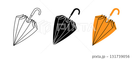 Compact folded umbrella icon in three versions outline, silhouette, and orange color