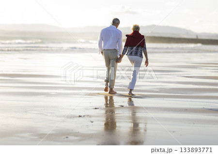 Senior couple holding hands walking barefoot on beach