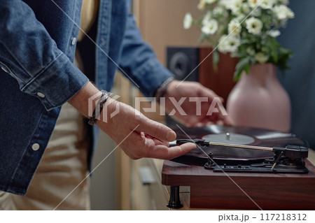Closeup of unrecognizable senior man setting up record player at home and enjoying music old fashioned way copy space