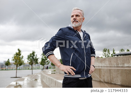 Chest up portrait of fit elderly man in sportswear with hands on waist looking away while resting after everyday jogging in city park against cloudy sky, copy space