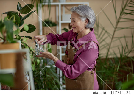 Side view portrait of elegant grey haired senior woman watering plants at home and enjoying gardening, copy space