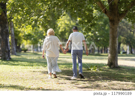 Elderly couple holding hands walking in the park