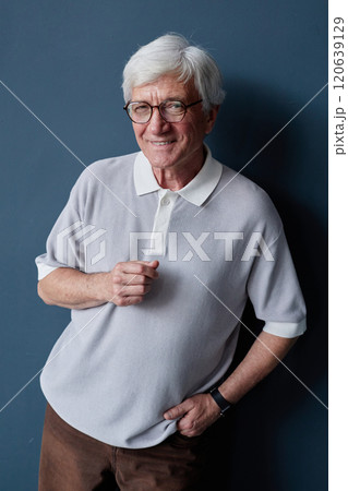Vertical studio portrait of white haired senior man smiling at camera posing casually against blue background in studio and wearing glasses