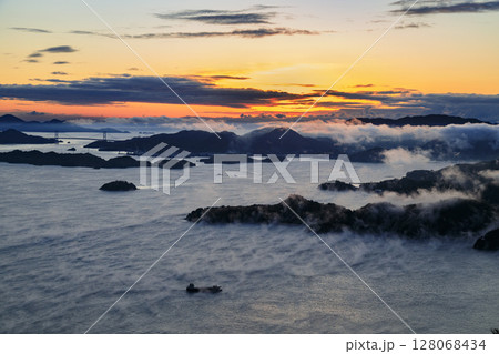 岡山縣笠岡市冬日清晨,從青薩山半山腰眺望,笠岡群島和鞆之浦在海霧中朦朧