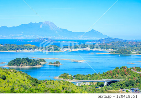 熊本縣上天草市初秋從仙岩山展望台看到的雲仙普玄岳和天草的景色