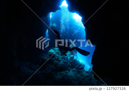宮古島市潛水點海底洞穴的女王房間出口處,潛水員和陽光普照