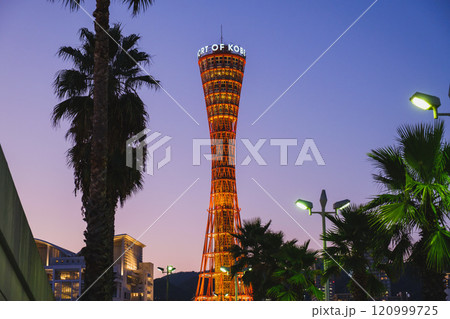 燈火通明的神戶港塔、海事博物館和半月