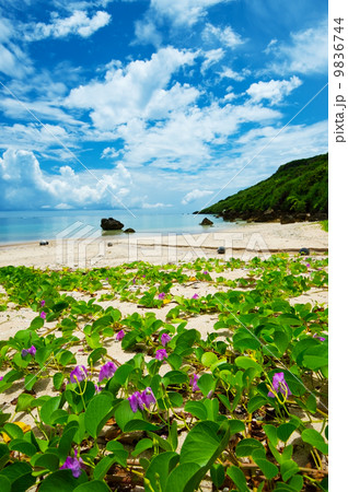 沙灘上的牽牛花。美麗的珊瑚礁和成群的熱帶魚。沖繩縣島尻郡慶良間諸島座間味島和阿室島
