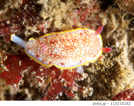 薩拉薩烏米蛞蝓在紅海藻上爬行