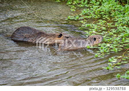 海狸鼠和鯉魚在灌溉渠裡游泳