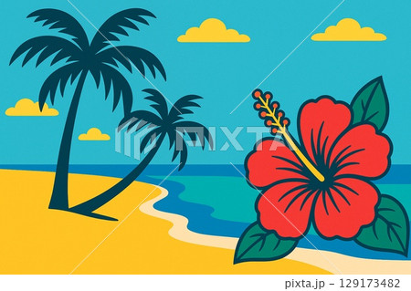 熱帶圖像:海洋、芙蓉、棕櫚樹、普普風格