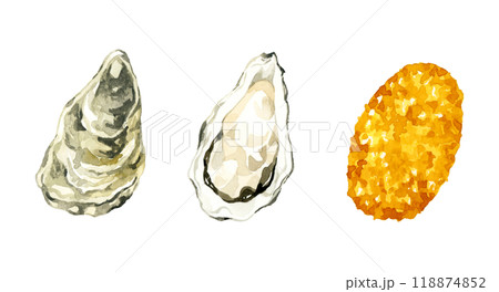一套牡蠣和炸牡蠣的烹飪和食物手繪水彩插圖材料。