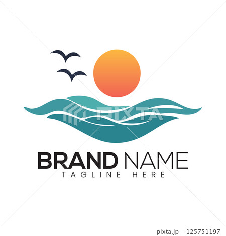 Abstract Vector Ocean Waves with Sun and Bird Beach Icon or Logo Design Template
