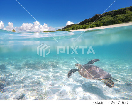 綠海龜等生物在珊瑚礁上悠閒地巡弋。美麗的珊瑚礁和成群的熱帶魚。島尻郡慶良間諸島的座間味島和阿室島