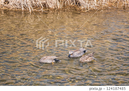 斑嘴鴨在河裡游泳尋找食物