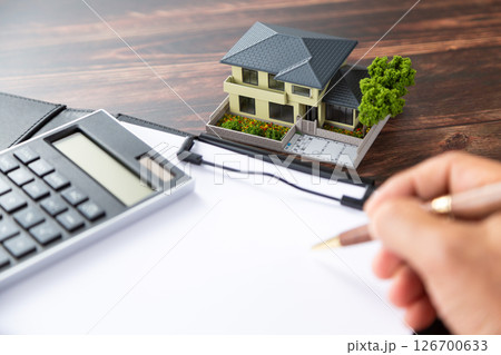 房子、活頁夾、計算機和筆
