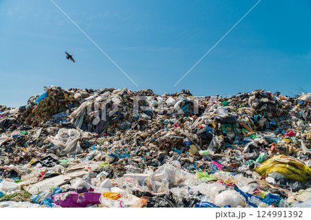 Waste landfill. Environmental pollution. Birds flying around