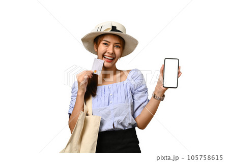 Excited woman tourist holding credit card and showing smartphone with blank screen. Holiday, vacation, traveling concept
