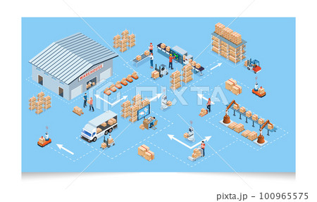 3D isometric logistics Warehouse Work Process Concept with Transportation operation service, Export, Import, Cargo, Forklif, Delivery Truck. Vector illustration EPS 10