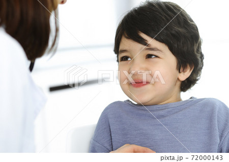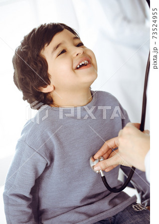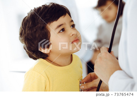 Woman-doctor examining a child patient by stethoscope. Cute arab boy at physician appointment. Medicine help concept