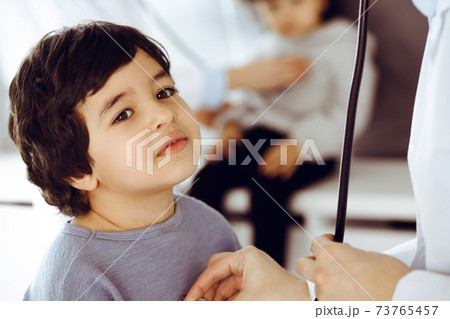 Woman-doctor examining a child patient by stethoscope. Cute arab toddler and his brother at physician appointment. Medicine concept