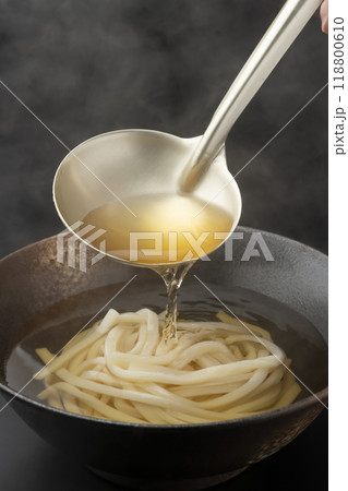 倒入烏龍麵湯 倒入湯料