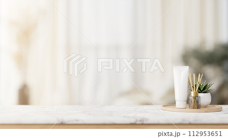 Luxury bath products on the table over blurred modern bathroom in background.