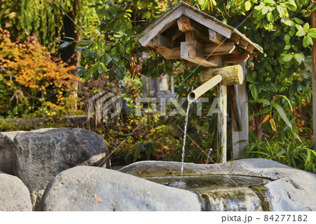 日本雨後的櫻花與竹籬笆