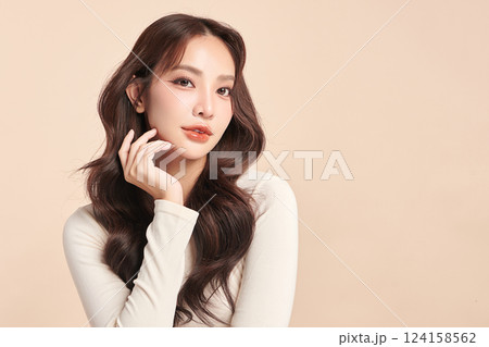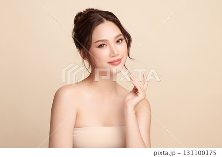 Beautiful young asian woman with clean fresh skin on beige background, Face care, Facial treatment, Cosmetology, beauty and spa, Asian women portrait.