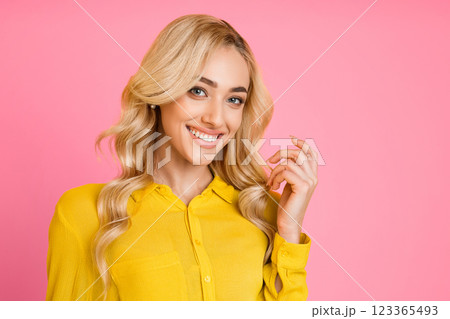 A woman with long blonde hair is smiling and looking to the left of the camera. She is wearing a yellow button-down shirt and is standing against a bright pink backdrop.