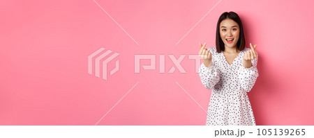 Lovely asian woman in dress showing korean heart signs and smiling, standing on romantic pink background
