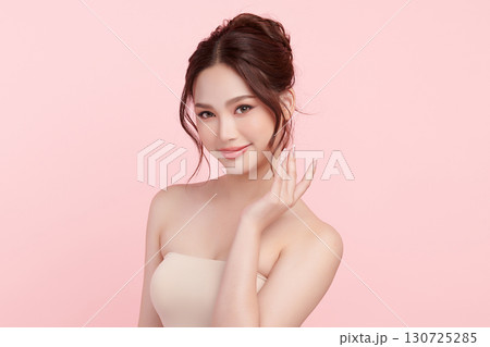 Beautiful young asian woman with clean fresh skin on pink background, Face care, Facial treatment, Cosmetology, beauty and spa, Asian women portrait.