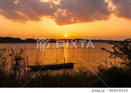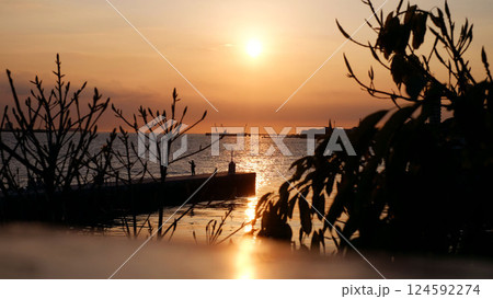 Evening landscape of Florida wetland flora. Lake water in southern tropical swamp at sunset