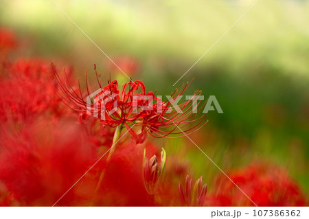 一簇鮮紅的蜘蛛百合沿著海濱盛開(東京都足立區東綾瀨公園)