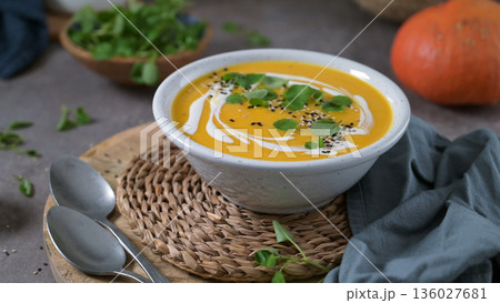 Creamy Pumpkin Soup with Swirls of Cream and Fresh Greens