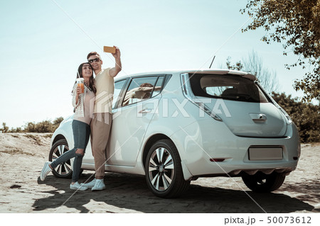 Positive delighted young family having break during trip