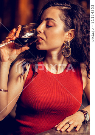 Close up of curly woman wearing red dress drinking red wine