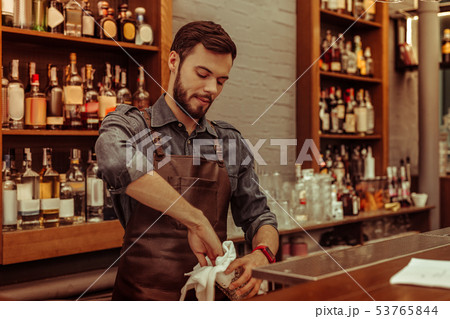 Handsome dark-haired bearded adult bartender polishing glasses at the bar