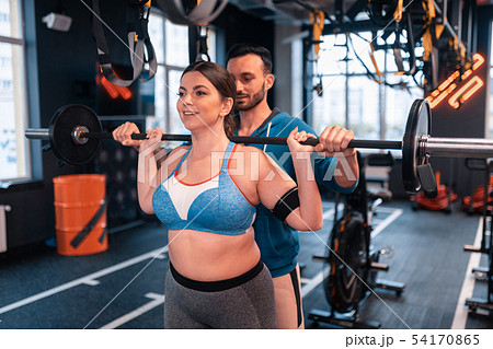 Plump woman working out with barbell near trainer