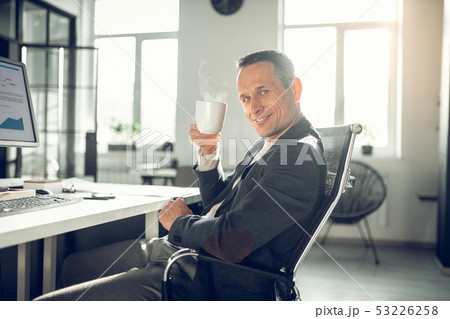 Handsome man smiling while drinking good coffee in the office
