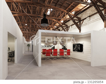 Modern office interior in a renovated industrial warehouse. Conference room with red chairs under an exposed wood beam ceiling. Corporate workspace design.