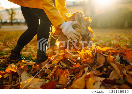 Woman cleans autumn park from yellow leaves. Volunteering, cleaning concept. Seasonal gardening.