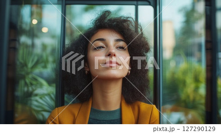 Close-up Portrait of a Young Woman with Curly Hair Looking Up